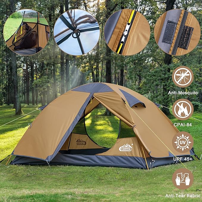 - 【Durability & Stability in Extreme Conditions】The 2 person backpacking tent model is built to last with anti-tear rip-stop fabric and reinforced seams, ensuring long-term durability. The sturdy aluminum poles, secure pegs, and adjustable wind ropes provide excellent wind resistance, while the UPF 45+ fabric shields you from harmful UV rays. Whether you're camping in the mountains or through unpredictable weather, this camping tent delivers the strength and stability you need for your adventures.