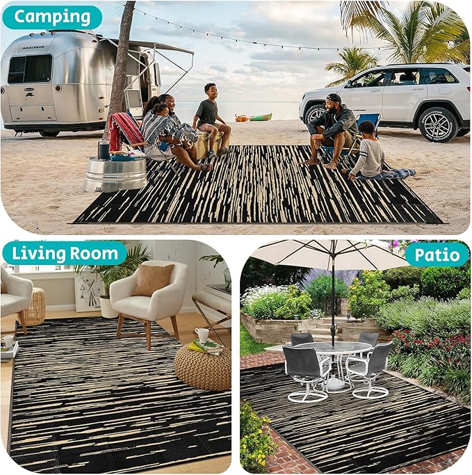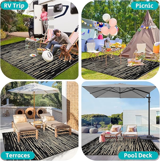 • XXL Large Reversible Outdoor Rugs: Featuring a classic striped pattern on both sides, this 8x10 ft outdoor area rug allows you to instantly refresh your patio, porch, backyard, deck, RV campsite. And this outdoor deck rug is reversible, two-sided design allows you to have two different looks,both sides can blend perfectly with nature and look very full and comfortable.