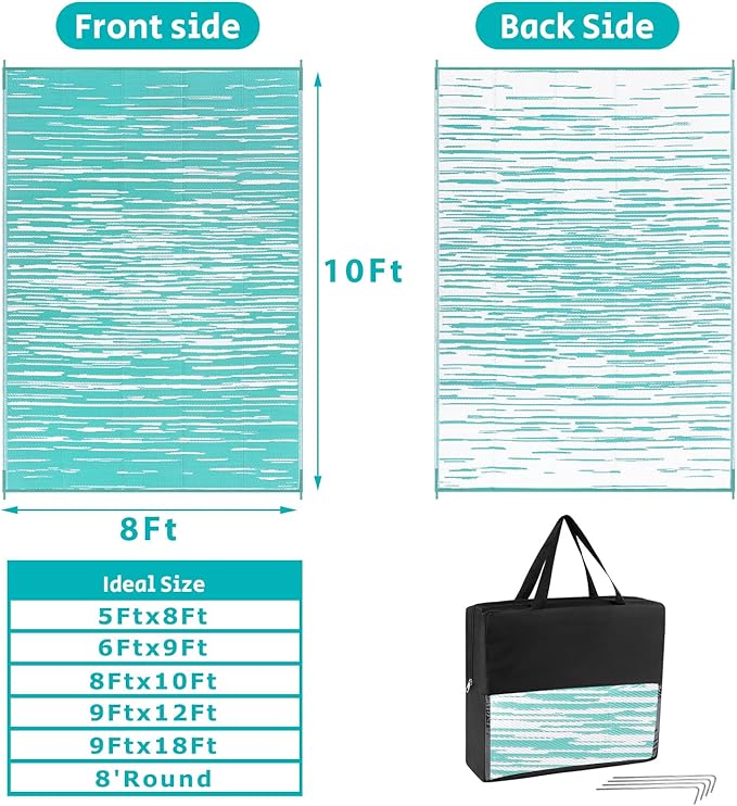 • Versatile Outdoor Carpet: The indoor outdoor plastic rugs have multiple choice in different colors(4'x6',5'x8',6'x9',8'x10',9'x12',9'x18',8'round), is ideal for a variety of indoor outdoor activities,like patio mat, deck rug, garden rug, beach mat, picnic mat, BBQ party mat, rv camping rug,pool rug,outdoor doormat,garage rug,front door mat,allowing you to have plenty of imaginable space for more fun.
