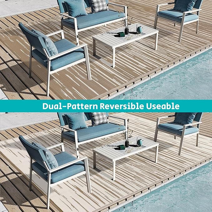 - XL Large Reversible Outdoor Rugs: Featuring a classic striped pattern on both sides, this rectangular 6x9 ft outdoor area rug allows you to instantly refresh your patio, porch, backyard, deck, RV campsite. And this outdoor deck rug is reversible, two-sided design allows you to have two different looks,both sides can blend perfectly with nature and look very full and comfortable.