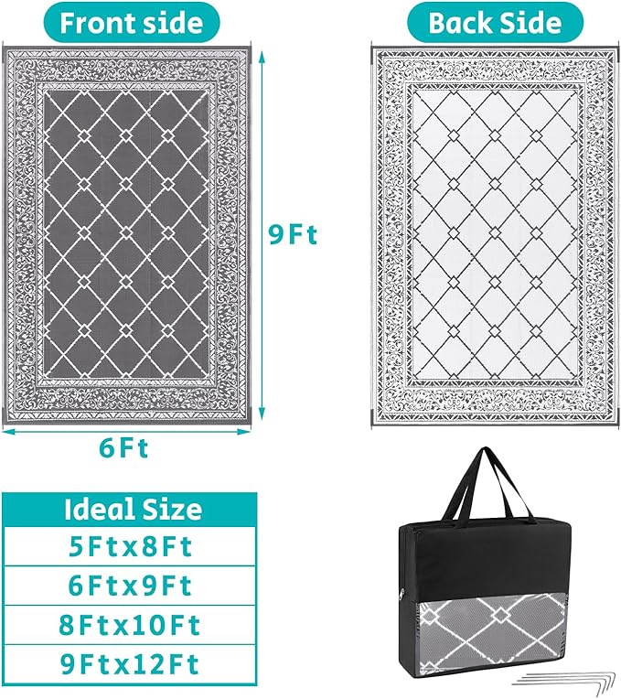 • Versatile Outdoor Carpet: The indoor outdoor plastic rugs have multiple choice in different colors(4'x6',5'x8',6'x9',8'x10',9'x12',9'x18',8'round), is ideal for a variety of indoor outdoor activities,like patio mat, deck rug, garden rug, beach mat, picnic mat, BBQ party mat, rv camping rug,pool rug,outdoor doormat,garage rug,front door mat,allowing you to have plenty of imaginable space for more fun.