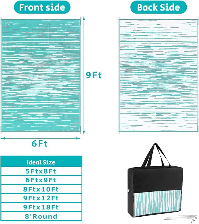 - XL Large Reversible Outdoor Rugs: Featuring a classic striped pattern on both sides, this rectangular 6x9 ft outdoor area rug allows you to instantly refresh your patio, porch, backyard, deck, RV campsite. And this outdoor deck rug is reversible, two-sided design allows you to have two different looks,both sides can blend perfectly with nature and look very full and comfortable.
