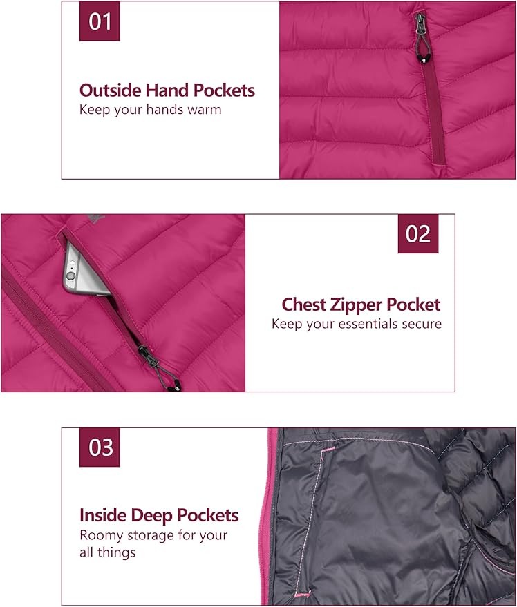 - MULTIPLE CONVENIENT POCKETS: 2 zippered hand warmer pockets, 1 zippered chest pockets and 2 inside deep pockets, great for keys, phone, wallet secure