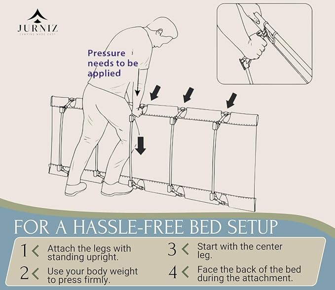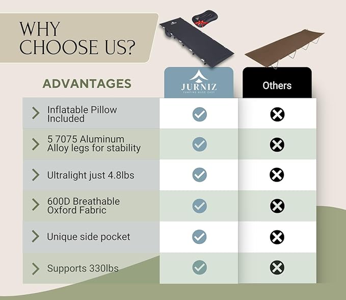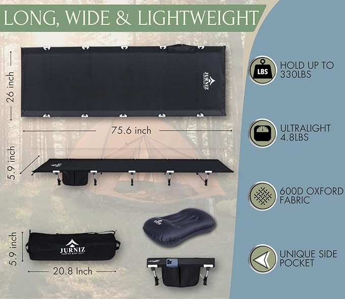 - đ¤ AN INCREDIBLE NIGHTâS SLEEP OUTDOORS: After a long, hard day of hiking through thick woods, conquering steep mountains and rugged terrains, you need and deserve a super comfortable nightâs rest. The JURNIZ camping cot and camping pillow await, ready to transport you to dreamy sleep so youâre refreshed and energetic for tomorrowâs adventures.