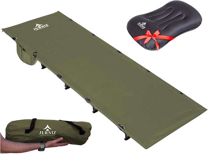 - đ¤ AN INCREDIBLE NIGHTâS SLEEP OUTDOORS: After a long, hard day of hiking through thick woods, conquering steep mountains and rugged terrains, you need and deserve a super comfortable nightâs rest. The JURNIZ camping cot and camping pillow await, ready to transport you to dreamy sleep so youâre refreshed and energetic for tomorrowâs adventures.