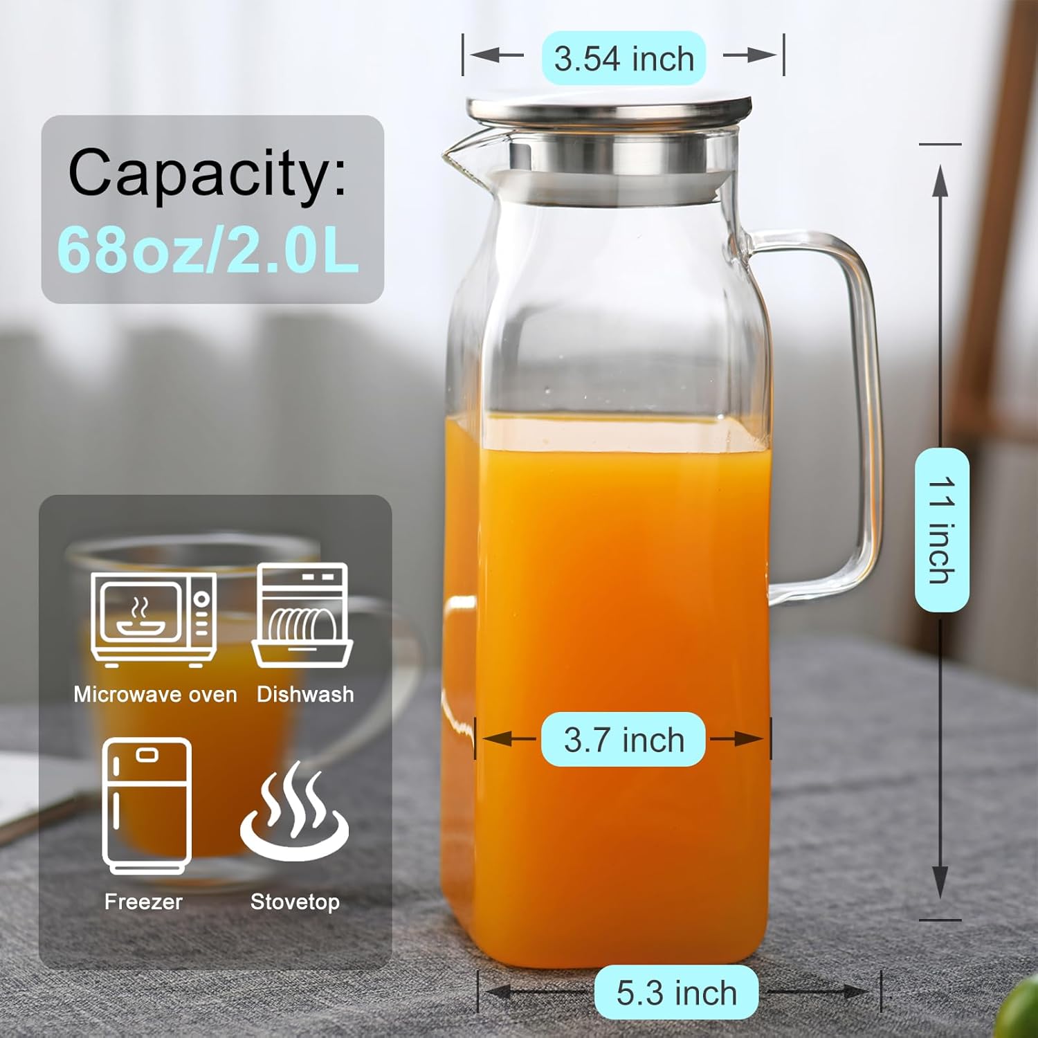 - 1. Superior Material:The glass pitcher made of high borosilicate glass, a clearer, stronger and lighter glass than traditional glass, the glass jug can withstand the temperature from -4℉ to 302℉, so you can safely pour boiling water into it.
