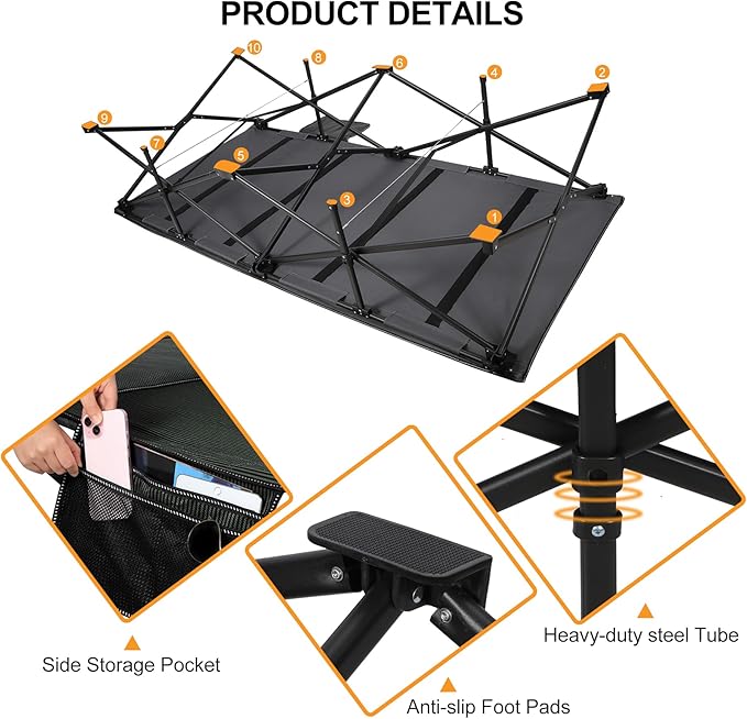 - User-Friendly Design: This foldable camping bed features a built-in pillow at the head, providing neck support and comfort while lying down. Additionally, a convenient side pocket is included for storing personal items.