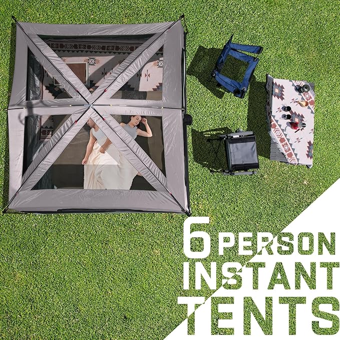 - 【High Quality Material & Durable】The 6 man camping tent is made of 190T polyester taffeta double-layer fabric coated with PU and the waterproof effect reaches 2000mm. The mesh of doors and windows adopts high-quality B3 mesh to isolate mosquitoes while ventilating, and the floor adopts thickened PE to give you better waterproofing effect. The main pole of the instant tent uses 19mm thick metal poles with 4 guylines, which can give you all-round protection in strong wind or heavy rain.