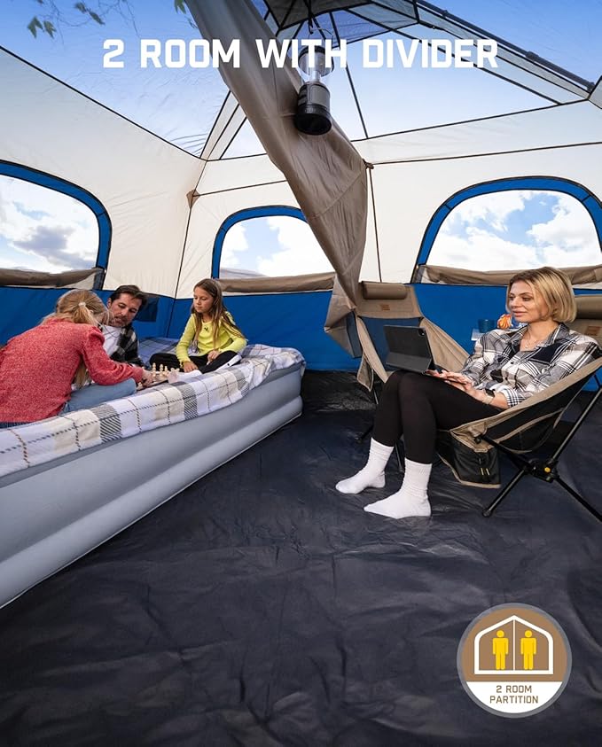 - Spacious Interior & Portable: The spacious tent measures 168 inches x 120 inches, large enough for 10 people. The interior seamlessly fits 2 Queen air mattresses. With a maximum height of 76 inches, the 10 person tent is spacious enough to easily stand upright, too. It is well-built using rock-solid carbon structural steel while weighing only 27.5 lbs, making it easy to carry for the smoothest camping trips