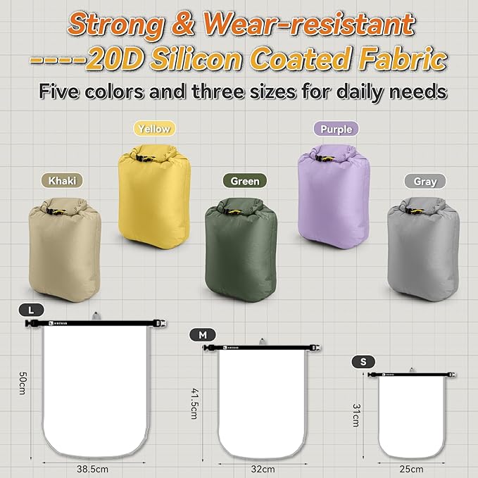 - Keep Your Gear Organized: A set of 3 ultralight dry sacks in three different sizes S(31*25cm)/M(41.5*32cm)/L(50*38.5cm),so you can easily recognize the contents.