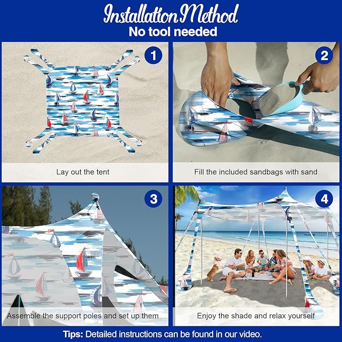 - 🔧【Quick and Easy Setup】It only takes a few minutes to set up and take down. Spread it out, then fill the sandbags, and add the poles. The included sand shovel is a nice bonus to fill 8 sandbags. Burying sandbags into the beach will make beach shelter more stable. One person can do it, making the outdoor beach day so easy and comfy!
