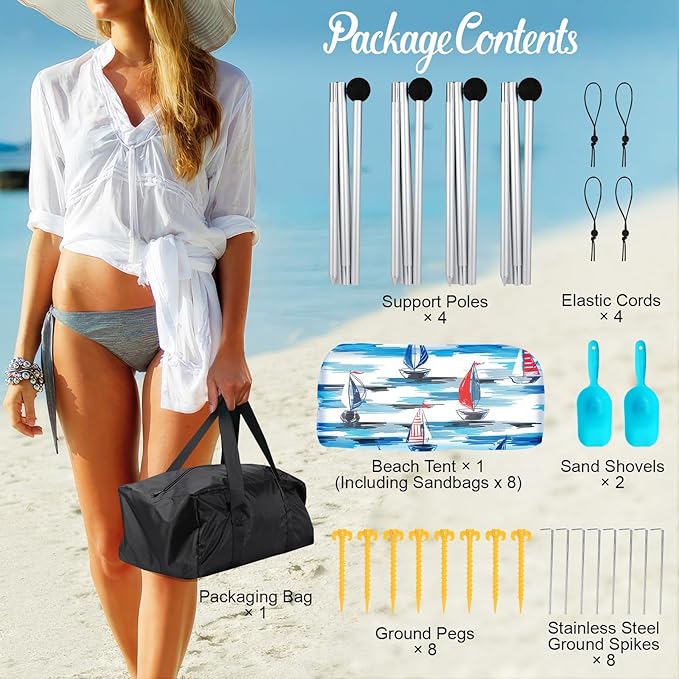 - 💨【Stands up to High Wind】Our upgraded beach tent sun shelter is equipped with 8 sandbags, 4 thickened aluminum poles and 4 windproof ropes, strong enough to withstand high beach winds, ensure stability and prevent collapse.