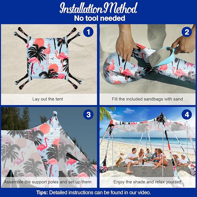 - 🔧【Quick and Easy Setup】It only takes a few minutes to set up and take down. Spread it out, then fill the sandbags, and add the poles. The included sand shovel is a nice bonus to fill 8 sandbags. Burying sandbags into the beach will make beach shelter more stable. One person can do it, making the outdoor beach day so easy and comfy!
