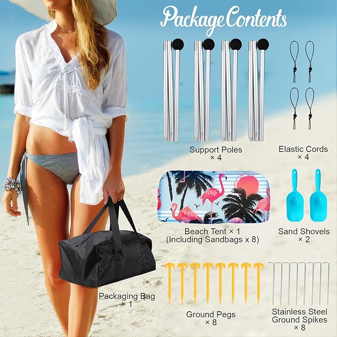 - 💨【Stands up to High Wind】Our upgraded beach tent sun shelter is equipped with 8 sandbags, 4 thickened aluminum poles and 4 windproof ropes, strong enough to withstand high beach winds, ensure stability and prevent collapse.
