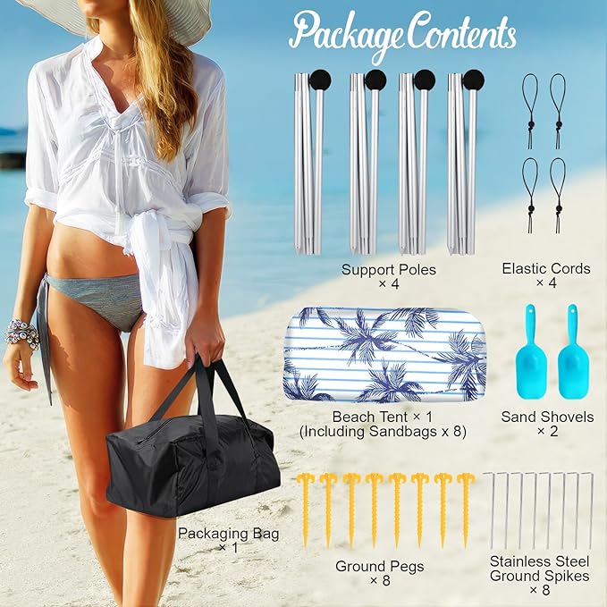 - 💨【Stands up to High Wind】Our upgraded beach tent sun shelter is equipped with 8 sandbags, 4 thickened aluminum poles and 4 windproof ropes, strong enough to withstand high beach winds, ensure stability and prevent collapse.