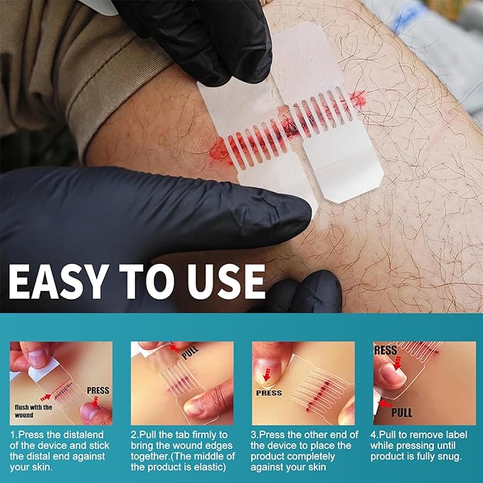 - Kit Includes : The wound closure kit includes everything you need to effectively close wounds. (4 emergency wound closure devices with a size of 72*25mm, 6 wound dressings with a size of 6*7cm)