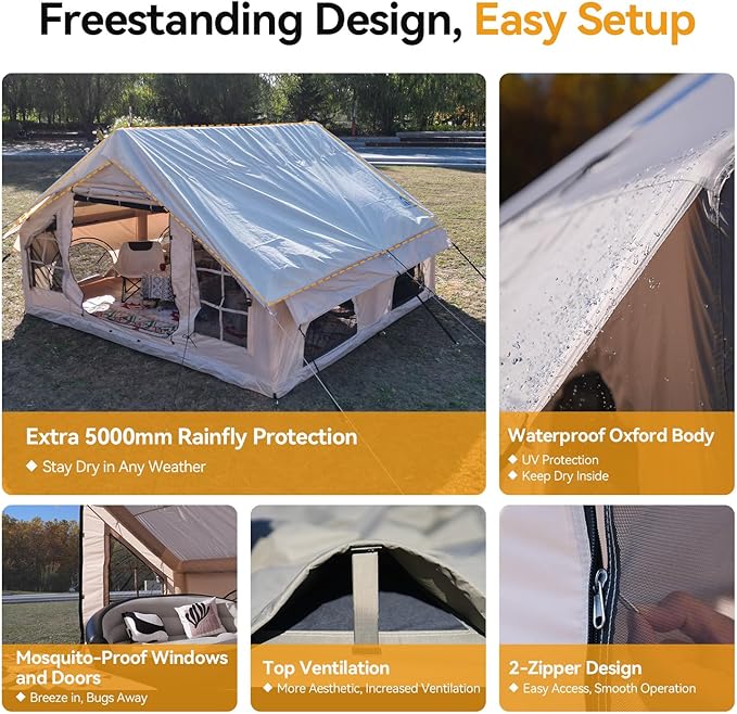 - 【Quick Setup and Sturdy Design】The inflatable structure makes setup a breeze—no complex poles required.This inflatable tent can be fully assembled in just a few minutes.Designed for stability, it includes reinforced ground stakes to adapt to various terrains and meet all your camping needs.