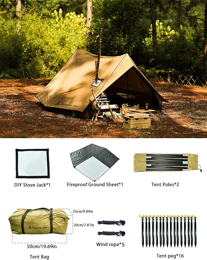 - 【Detail-Oriented Design】Complete with necessary accessories, including a tent bag, fireproof ground tarp, 2 tent poles, 16 stakes, 5 guy ropes, and four hooks, our camping hot tent guarantees quick and hassle-free setup. Precision detailing and a double zipper design enhance durability and waterproofing, ensuring a secure shelter in any condition.