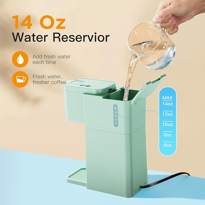 - 6~14oz Brew Size: Adjust the brew amount by filling to the appropriate ounce level. Water tank is not removable and needs to add water each time for fresher and more flavorful coffee