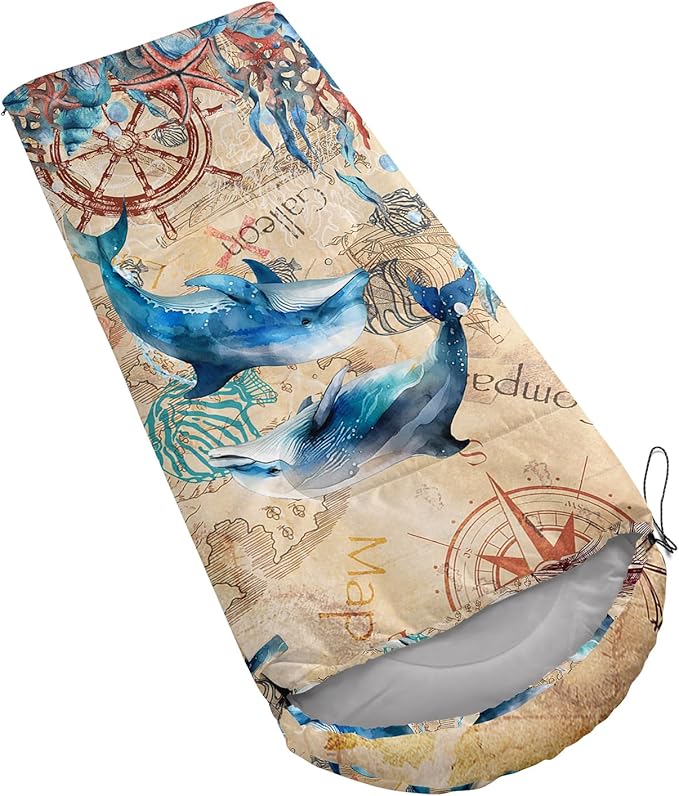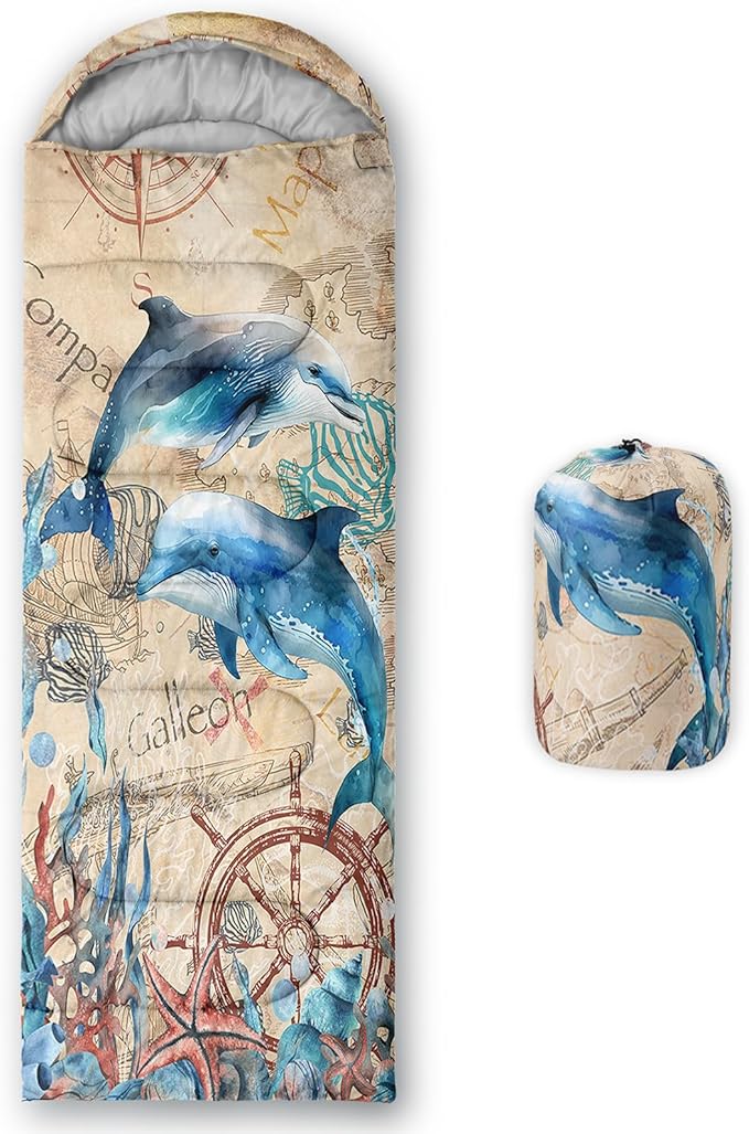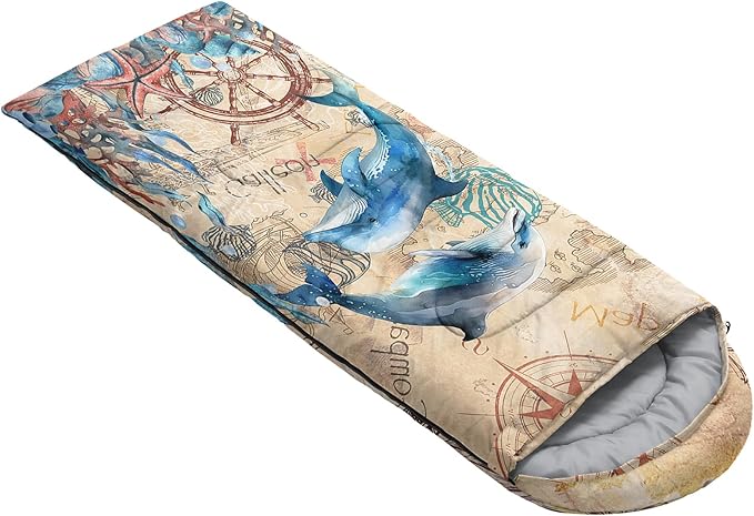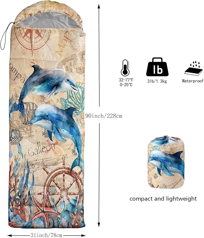 - Unique Dolphin Design:This Dolphin pattern sleeping bag is made of 3D digital printing with vibrant colors and patterns,size: 31W x 90L inches,temperature range: 32℉-77℉ (0℃-25℃),it also also have a weather resistant waterproof design to keep you warm and prevent you from any dampness,can be used in 3 seasons