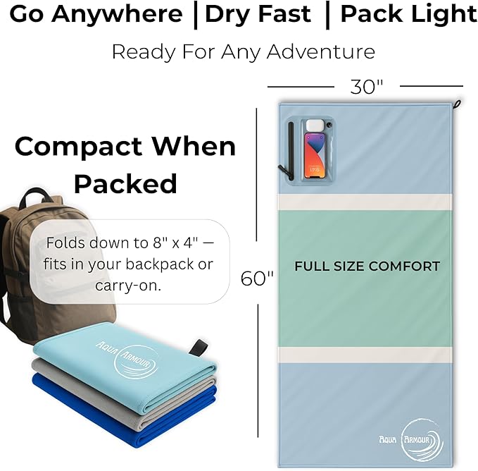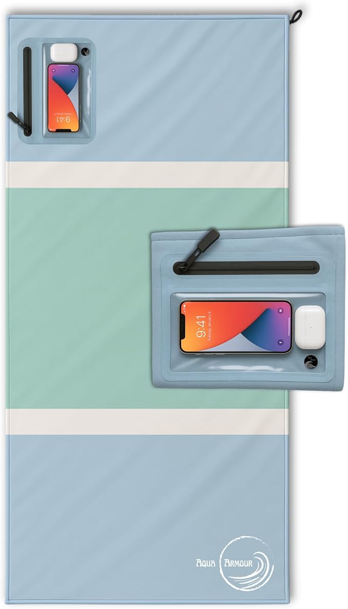 Go Anywhere Towel with Waterproof Phone Pouch - Quick Dry, Sand Free, Compact Beach Towel for Pool, Boat, Travel, Camping, Hiking & Outdoor Adventures (Mint)