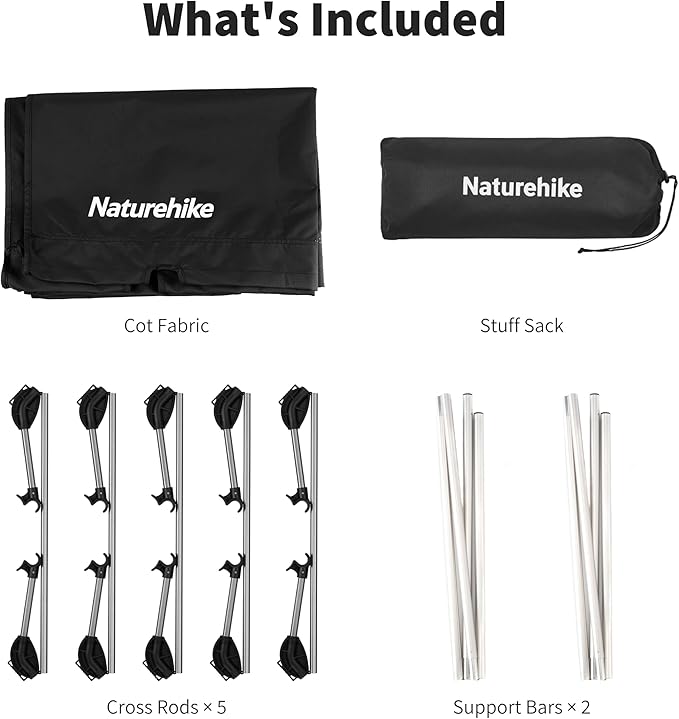 - 【60s Set Up & Take Down】Simply insert 2 long support poles into the 2 sleeves of the cot sheet and lock the 5 support legs. The shock-cord tube will make the setting up and taking down much simple. Within 60 seconds you can set your camp cot up and enjoy the comfort