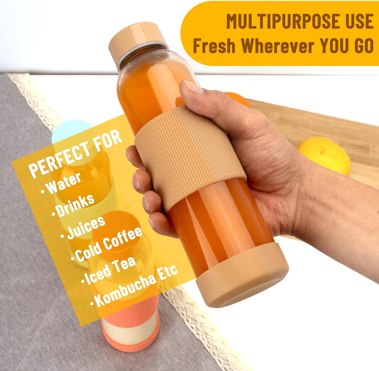 - EVERYTHING TAKES BETTER IN GLASS: the 18 oz glass water bottle is ideal for storing juices, water, drinks, brew, cold coffee, iced tea, kombucha, soda etc, Ensures efficient use of space anywhere or in the refrigerator