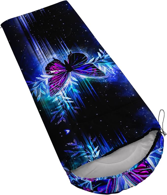 - Unique Butterfly Design:This Butterfly pattern sleeping bag is made of 3D digital printing with vibrant colors and patterns,size: 31W x 90L inches,temperature range: 32℉-77℉ (0℃-25℃),it also also have a weather resistant waterproof design to keep you warm and prevent you from any dampness,can be used in 3 seasons