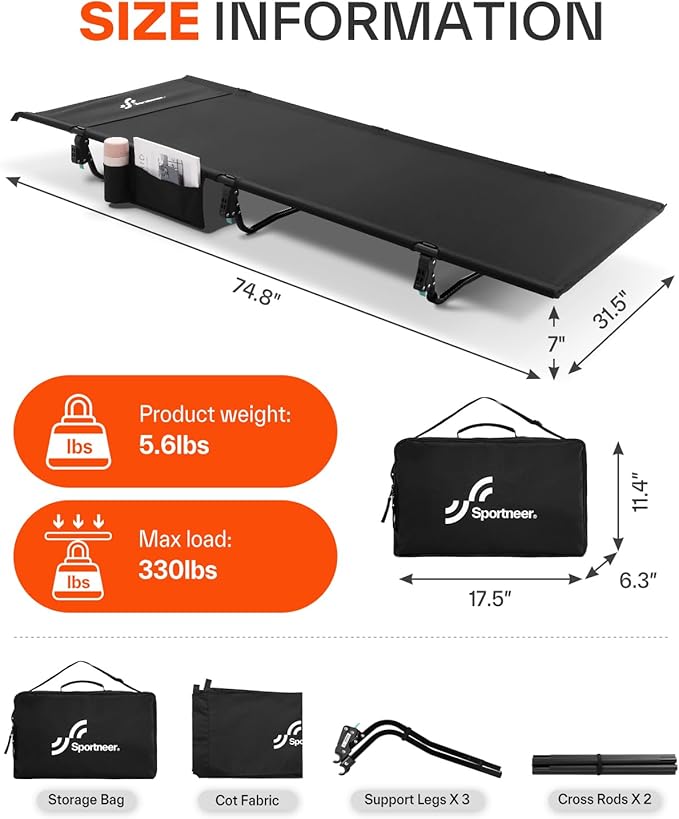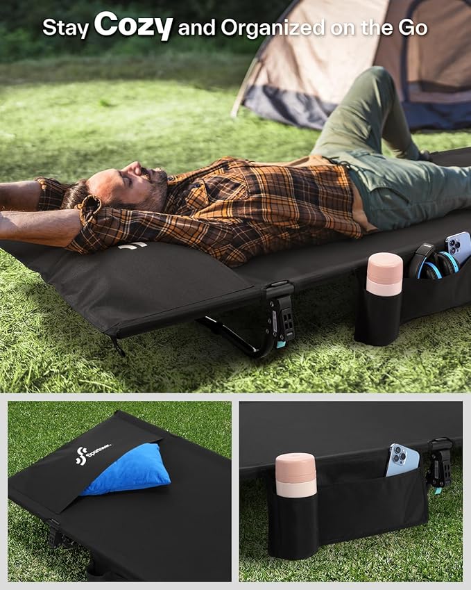 - Personalized Pillow Pocket and Side Pockets: The Sportneer camping cot features a personalized pillow pocket (pillow not included) and side pockets for easy access to essentials like water bottles and phones. Whether you're on the go or at camp, you'll appreciate the thoughtful comfort and convenience of this lightweight cot, making your outdoor adventure worry-free.