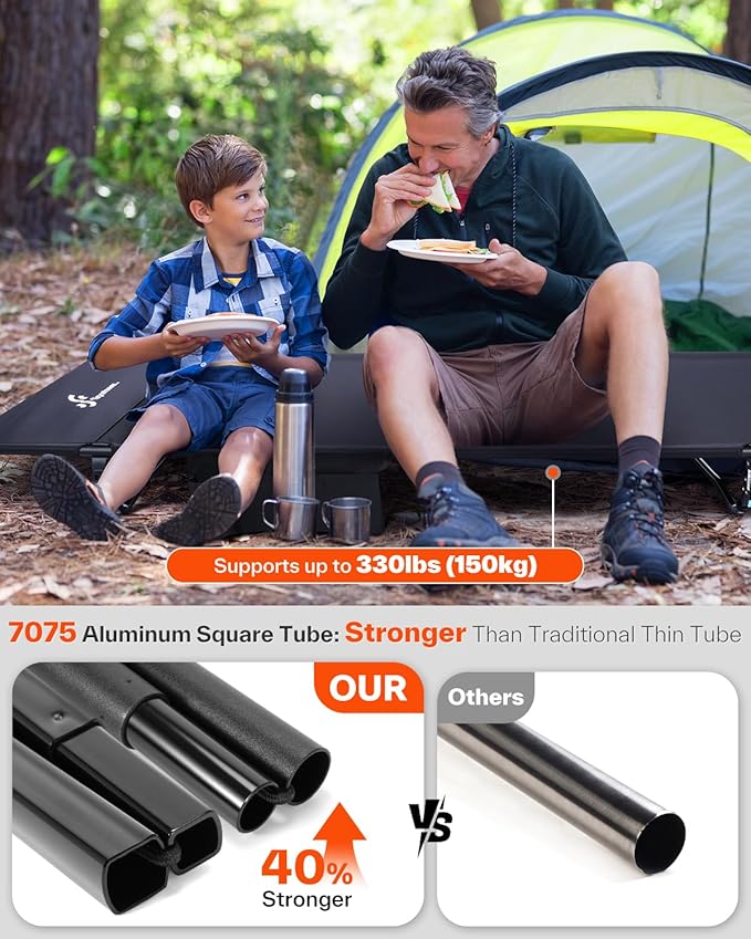 - Innovative, Sturdy Design: Reinventing durability and stability, this camping cot features aerospace-grade 7075 aluminum square tubes, which distribute weight more evenly than traditional round tubes, improving strength by 40%. Weighing just 5.6 lbs, this ultralight camp cot can support up to 330 lbs, ensuring unmatched stability whether you're sleeping or sitting with a companion.