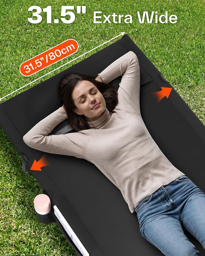 - 31.5" Extra-Wide Design for Enhanced Comfort: This camping cot features a 31.5-inch extra-wide surface and a taut, flat design, offering ample space and stable support for you to stretch out and enjoy a more comfortable sleep. Ideal for outdoor camping, hiking, road trips, and mountaineering, it also serves as a convenient indoor nap bed, emergency folding bed, or guest bed, adapting to various situations and needs.