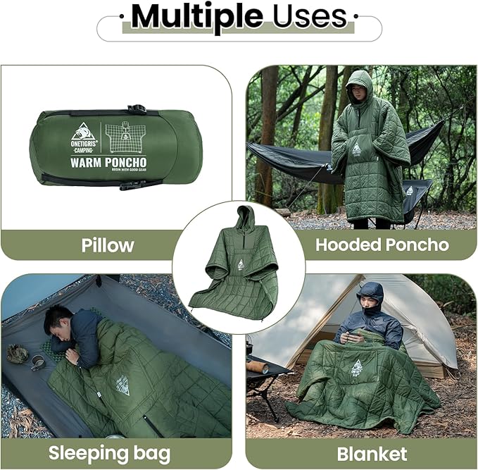 - 2 Pack Honcho Poncho-Multifunctional Comfort: With buttons and elastic straps, OneTigris camping blanket effortlessly transforms into a poncho, sleeping bag, quilt, wearable blanket, or shawl. Slip on the drawstring hood, nestle your hands into the spacious pocket, and feel the warmth embrace you, all while staying free to move.