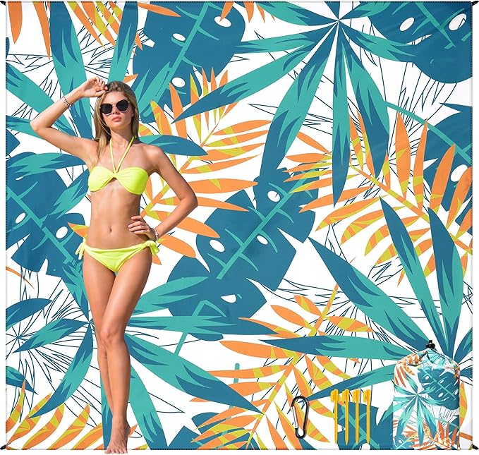 Beach Blanket Waterproof Sandproof Beach Mat 79”x 83” for 1-4 Adults Quick Drying Durable Outdoor Picnic Mat for Beach Festival Travel Camping Hiking (W&GN&Y-Palm, 79"×83"(4 Person))