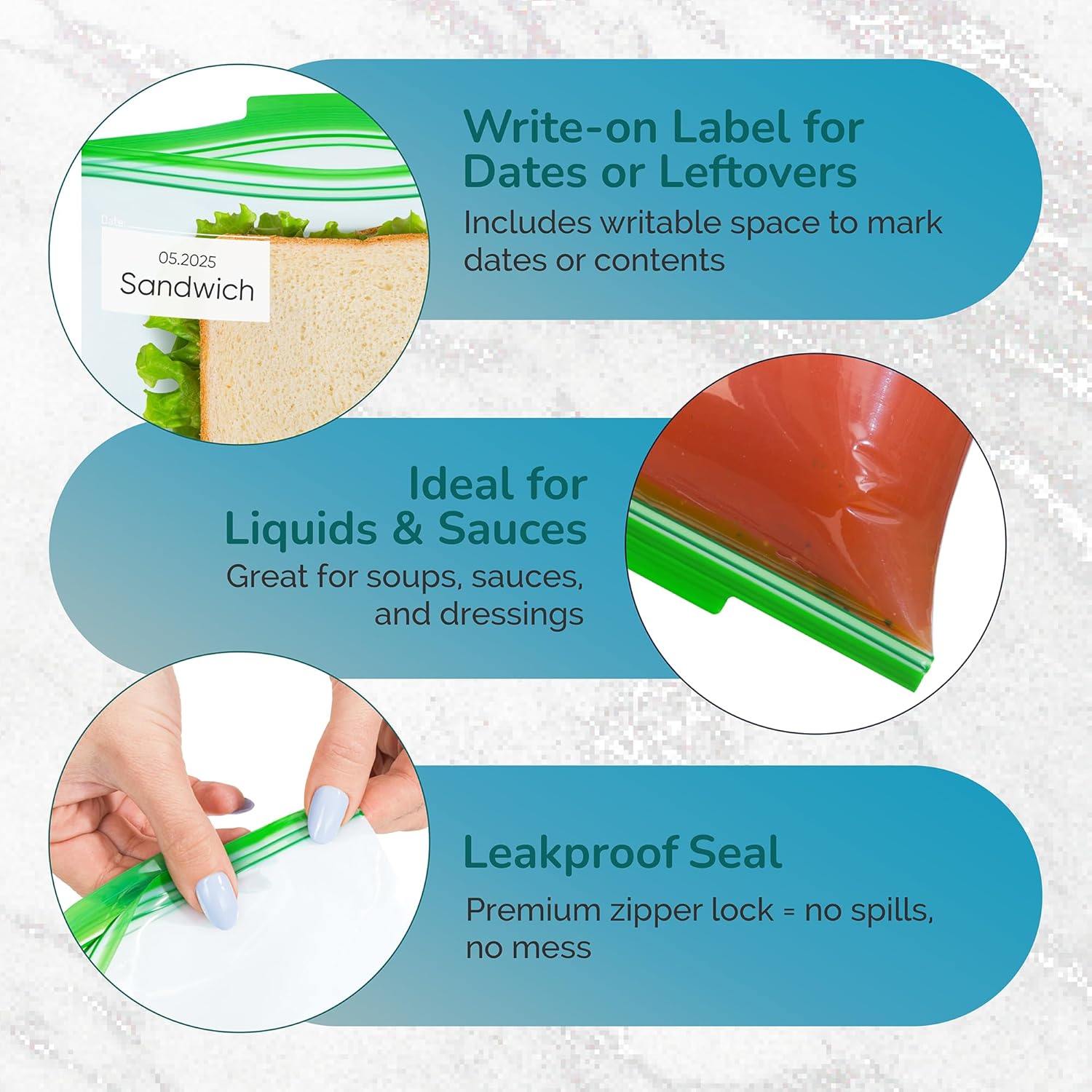 - 🔹 50 Count Sandwich Zipper Bags — Reusable plastic sandwich bags (5.9" x 7" x 1.5") with expandable bottom for lunch, snacks & meal prep; also work as plastic storage bags with zipper for fridge, freezer & everyday food storage