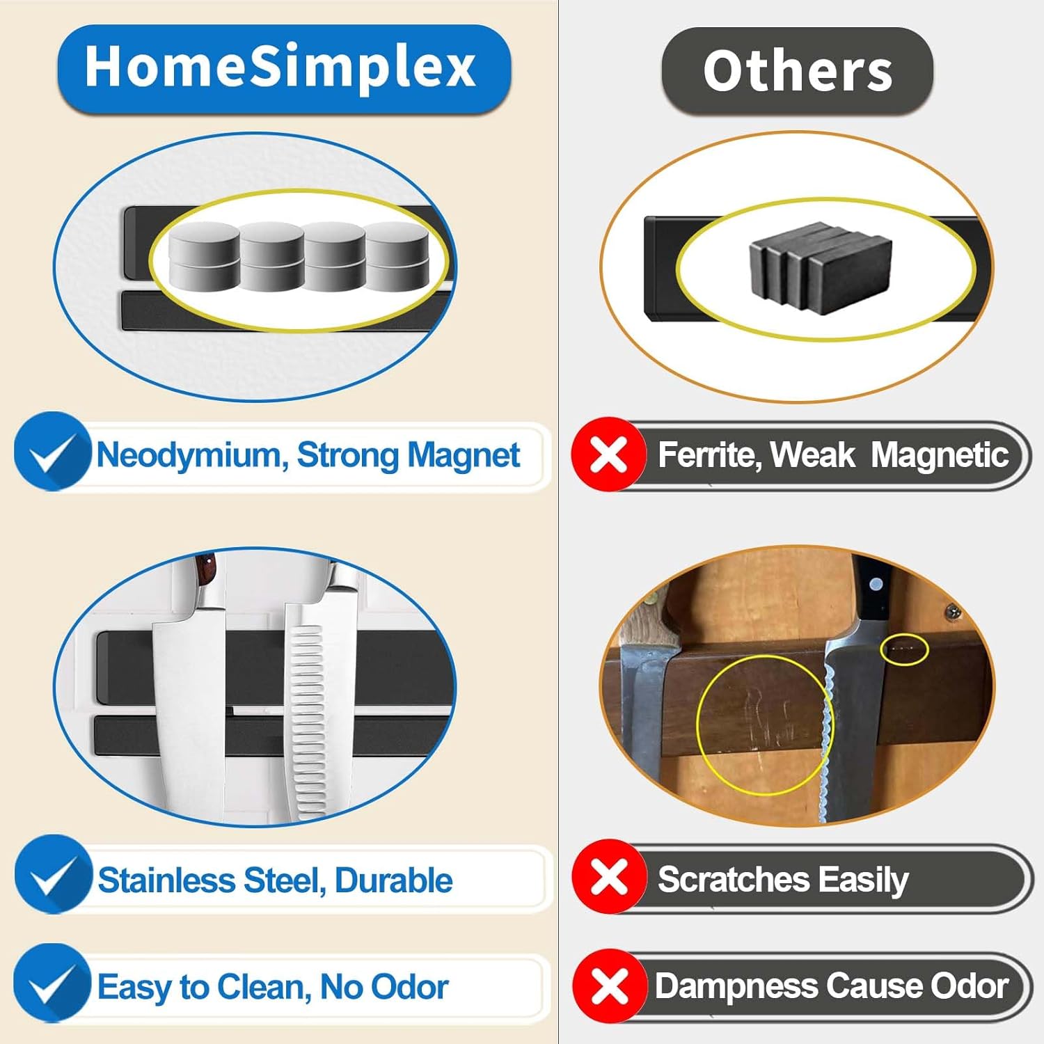 - 【Premium 304 Stainless Steel & Secure Hook Design】This magnetic knife holder no drill is crafted from high-quality rust-proof 304 stainless steel for damp kitchens. Our patented double-bar adhesive magnetic knife strip for wall structure with narrow-gap hook slots prevents accidental falls, safely holding non-magnetic items