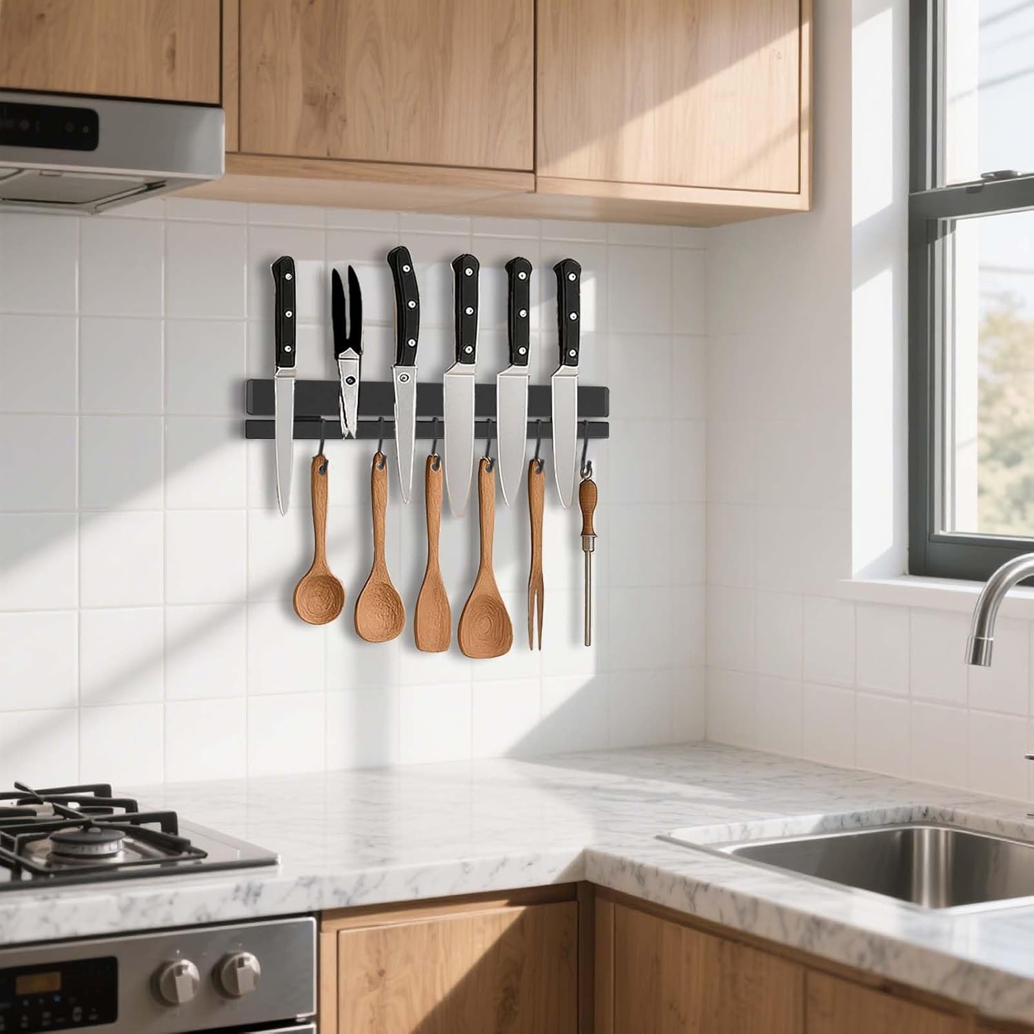 - 【17" Multifunctional Storage with 12 Hooks】Our upgraded 17-inch kitchen knife magnetic holder holds 5-8 knives and includes 12 dedicated stainless steel hooks. This magnetic tool holder strip eliminates clutter by storing knives, tools, and utensils