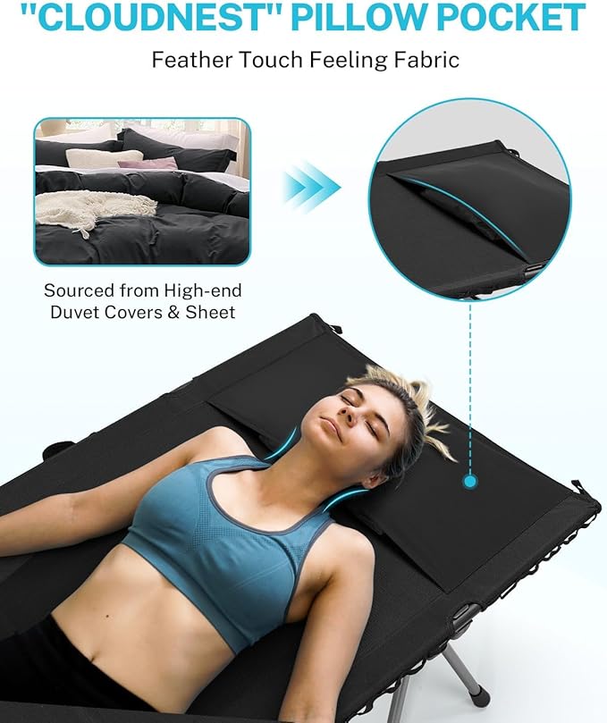 - 【Easy to Assemble】The cot uses the 5th-generation upgraded lever-locking system, which makes setting up a camping cot more convenient. It can be installed easily in four steps and the installation can be completed in only 60 seconds