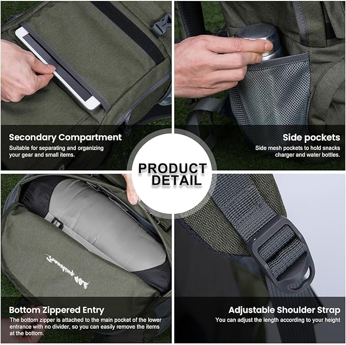 - Well-designed details: This outdoor backpack has many clever and convenient designs. The bottom compartment provides direct access to the main compartment; there is also a dedicated compartment for a water bladder (WATER BLADDER NOT INCLUDED), In addition, various shrink straps can also carry camping equipment such as trekking poles, sleeping bags and tents.