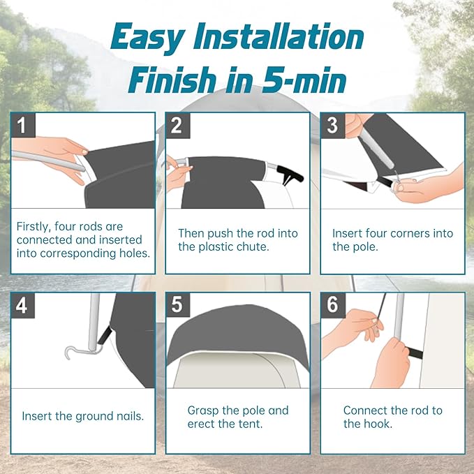 - [5-Minute Easy Setup]: Pre-attached poles joints allow quick assembly (incl. 4 guy ropes & 8 stakes),Crosship portable shower tent for camping with visual instructions for all users.