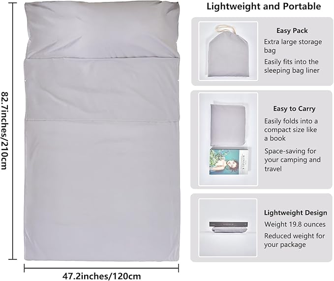 • Versatile Design: The liner works as a summer camping sleeping bag with a pillow pocket that can stuff clothes to use as a pillow. It also serves as travel bedding, replacing the need to take sheet, pillowcase and blanket. Fits most hotel bed sizes