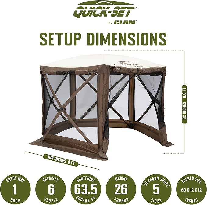 CLAM Pop Up Screen Tent, Outdoor Camping Gazebo Canopy, Adventure with Wind Panels, 9' x 9', Brown