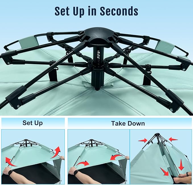 - Outdoor Protection & Great Ventilation - Premium 210t sun-proof material plus a special embedded silver-coated material to provide great UV protection from the sun and 3 added roll up openings maintain airflow to keep the tent cool when staying inside.