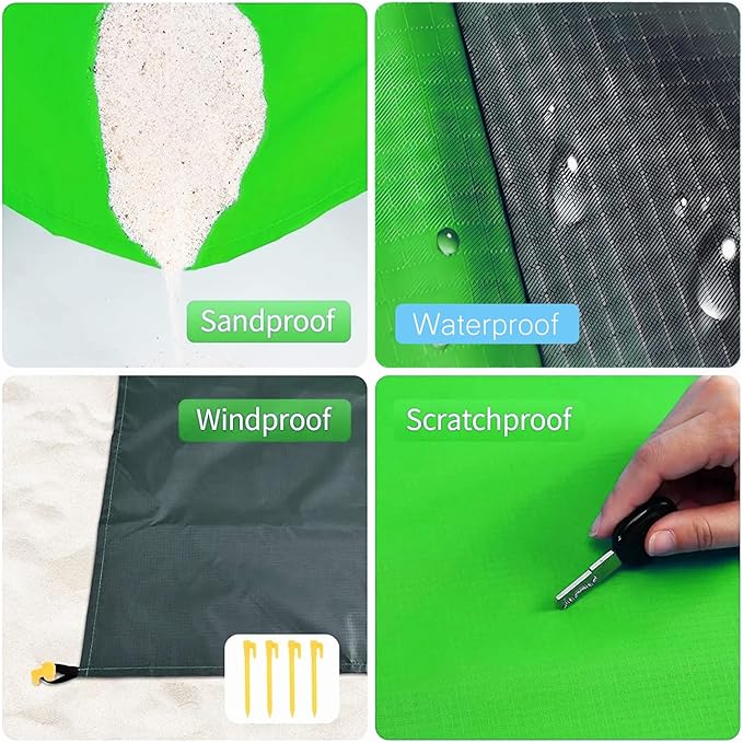 - ✔OUTSIDE BEACH BLANKET - The extra-large beach blanket provides ample space for lounging, picnics, or family gatherings. Including 1 * Sand Proof Beach Mat;4 * Durable ABS Anchors Stakes; 1* Carabiner; 1 * CARRY BAG.Whether you're at the beach, park, or camping, this oversized picnic blanket ensures comfort and convenience. Keeps all your beach stuff & beach supplies sand-free