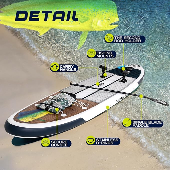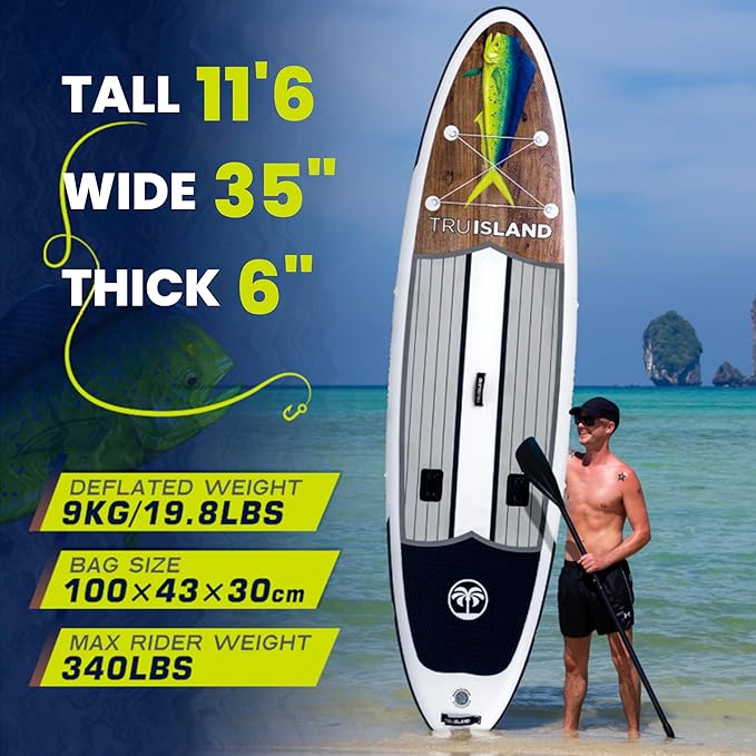 - Paddle Board Size: TRU Island Inflatable Stand Up Paddle Board is made with the perfect size for stability , 11"6 x 35" x 6". With a wider deck and wider nose, it can carry up to 450 lbs‼ An extra 3’ of width (compared to a 32’ board) is designed to provide better stability and striking balance.Thus providing you with a more excellent fishing experience