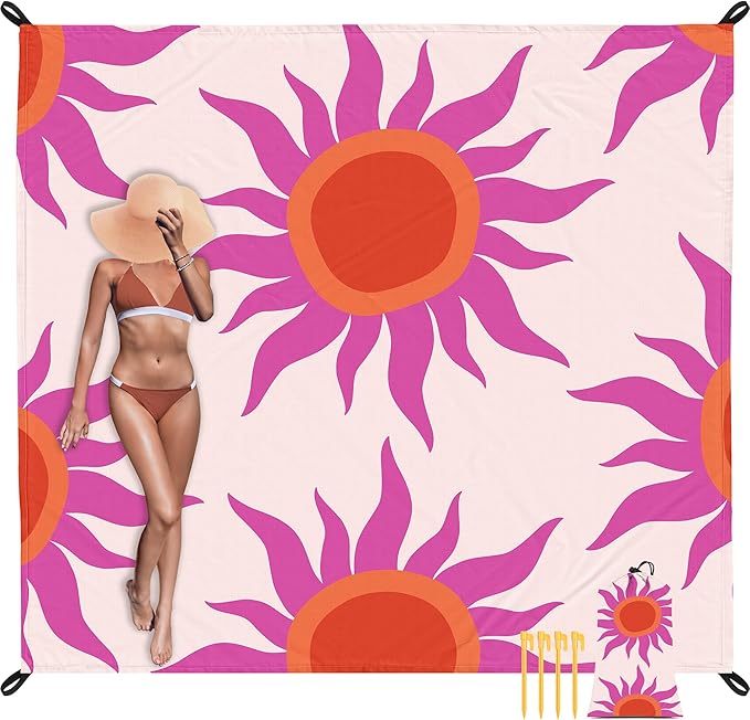 - Boho Sunset Design: Skynature’s beach blanket features a vibrant orange sun and purple boho-inspired sunset print, blending minimalist artistry with bold, eye-catching colors. Perfect for adding a free-spirited, bohemian touch to your beach picnics, festivals, or cozy outdoor moments.