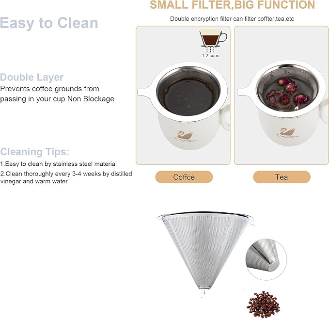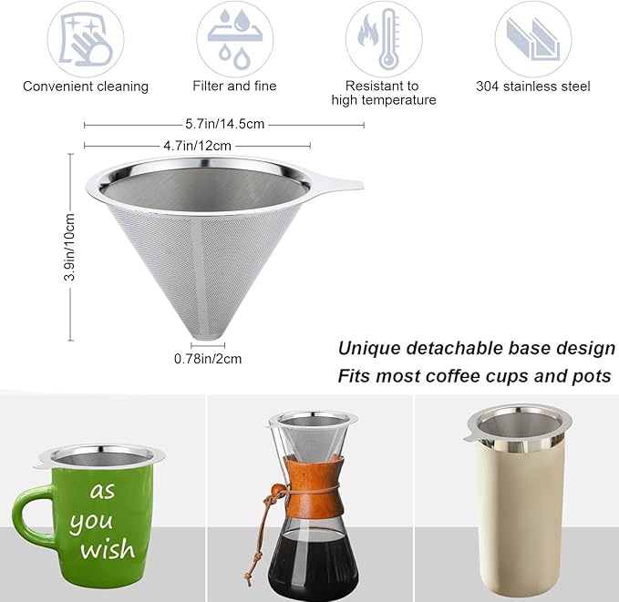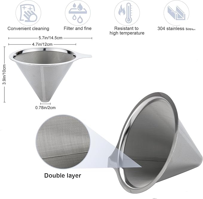 - With our coffee cone filter from durable stainless steel.just rinse and wipe it dry or place it inside your dishwasher.easily clean our coffee filter,the filter can be used always for you.