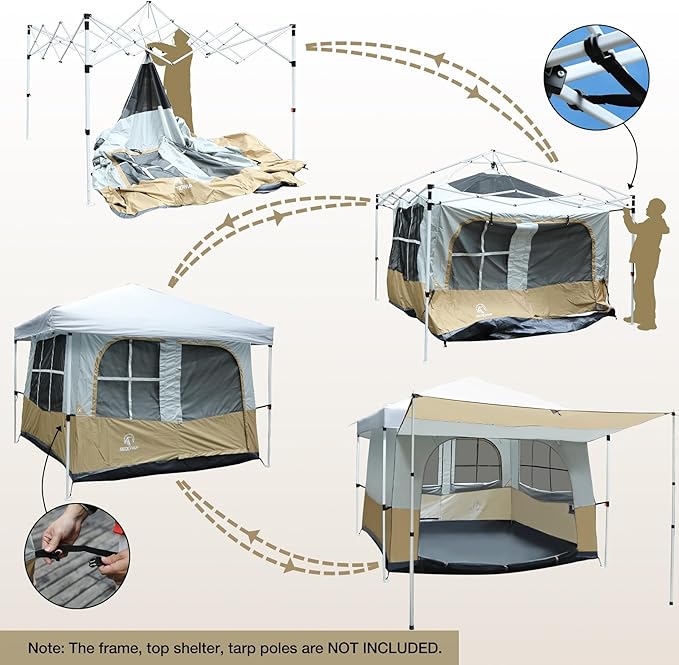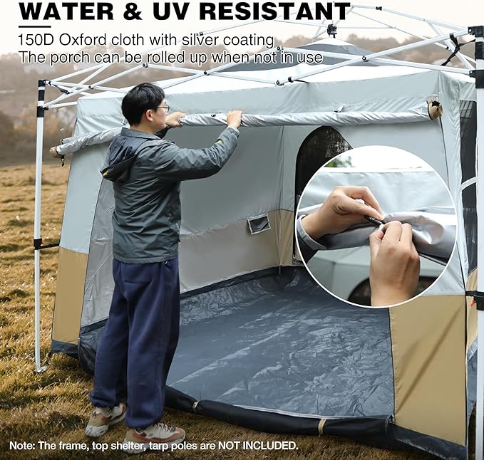 - Convenient Porch Design: The built-in porch extends the outdoor space of the cabin tent, creating a shaded area perfect for relaxation. It's an ideal spot to enjoy a cup of coffee in the morning or unwind in the evening. When not in use, the porch can be easily rolled up with the olive buckles, saving space and maintaining the tent's sleek appearance.(Please note: The inner tent contains NO SUPPORTING FRAME and must be hung under your own pop up canopy using your own tarp pole for proper setup.)