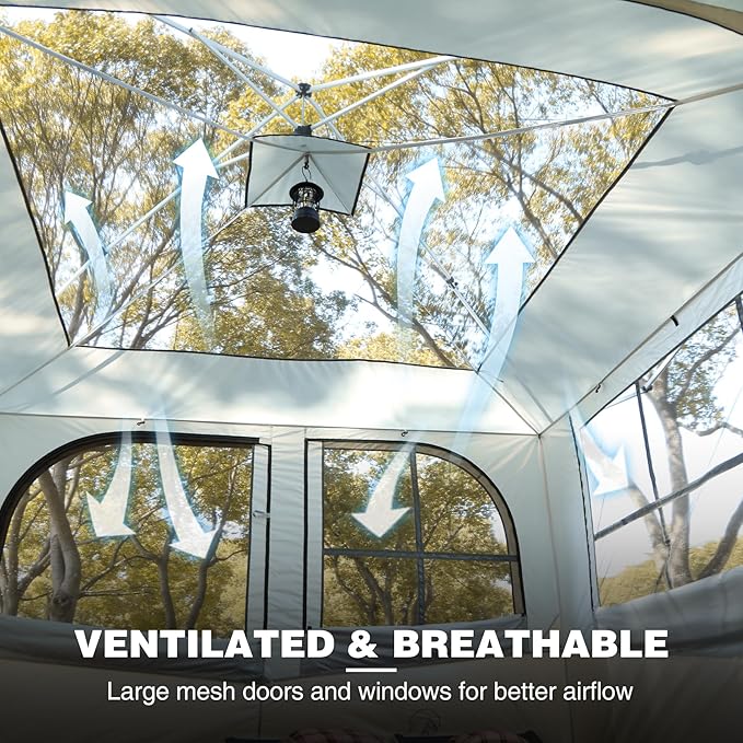 - Excellent Ventilation & Views: Featuring double-layer mesh windows and doors on 3 sides, along with an extra-large mesh skylight on the top, this camping cube offers outstanding ventilation. At the same time, it effectively keeps mosquitoes and other insects out, ensuring a bug-free outdoor experience. The oversize D-shaped rear screened door not only provides a great view but also contributes to better air circulation.