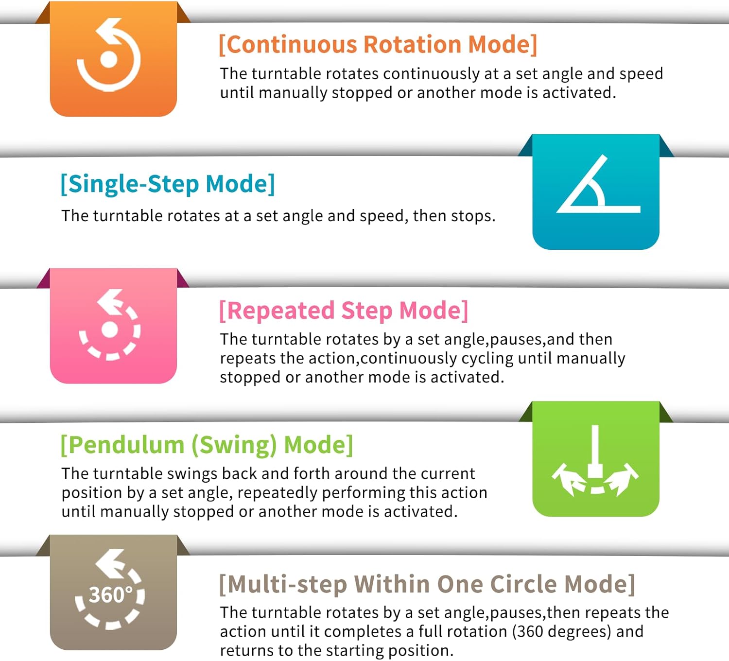 - Special Feature : Five rotation modes, High-Precision stepper turntable, Multi-step Within One Circle Mode, Pendulum (Swing) Mode, Set the current position and return to the position Five rotation modes, High-Precision stepper turntable, Multi-step Within One Circle Mode, Pendulum (Swing) Mode, Set the cu… See more