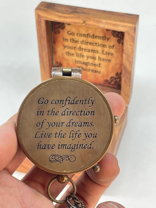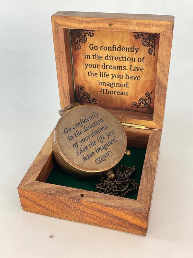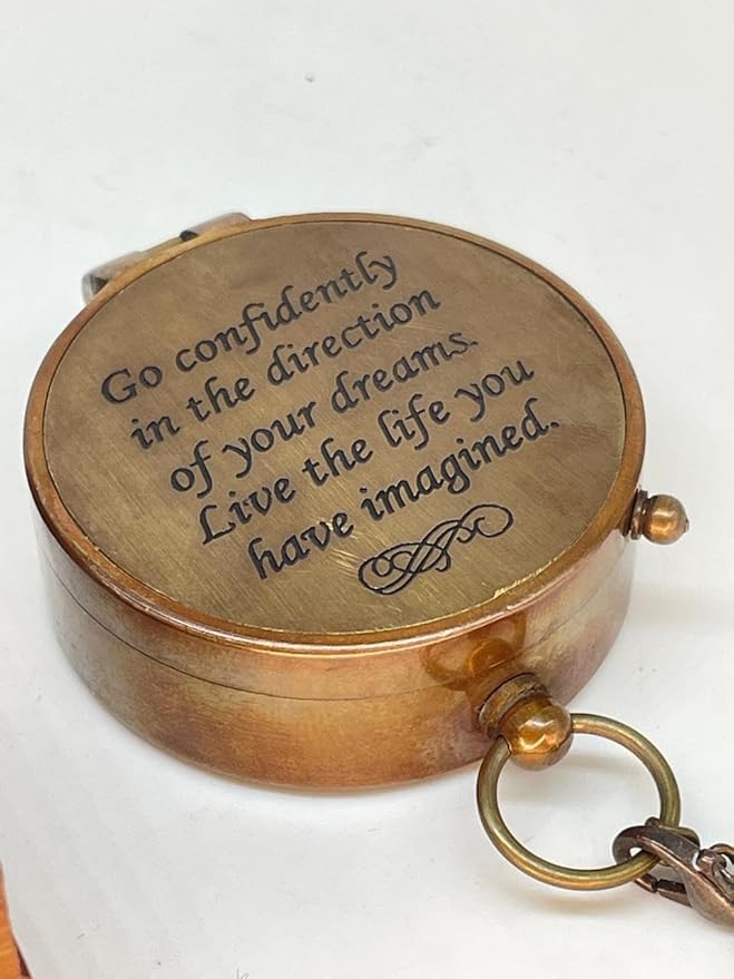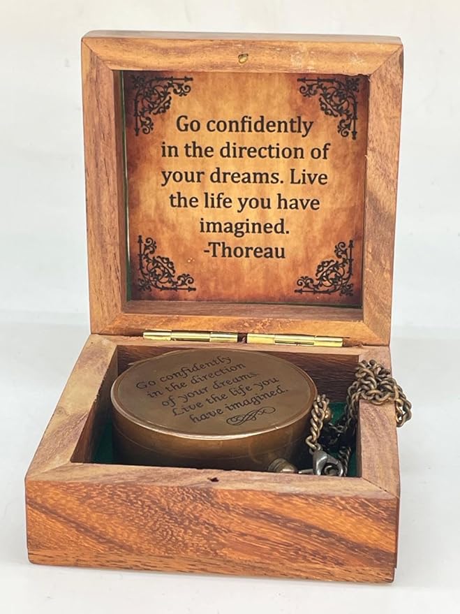 • 🌟FAMOUS QUOTE: Solid Sundial Compass with any Engraving you Want. It Custom with a Good Quote “Go Confidently in the Direction of Your Dreams. Live the Life you have Imagined”. Kala Pocket Sundial Compass Comes with Chain and Handcrafted Wooden Box as shown in the Picture.